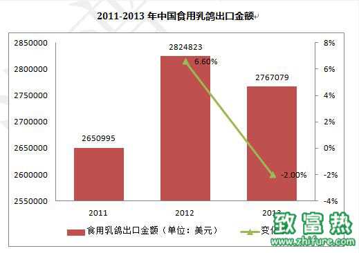 2011年中國食用乳鴿的出口金額為2650995美元。2012年中國食用乳鴿出口金額為2824823美元,同比增長6.6%。2013年中國食用乳鴿出口金額為2767079美元,同比下降2%。