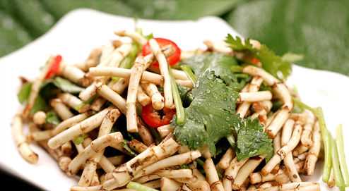 魚腥草是一種古老的植物,在我國的很多地方都有分布。它的食用價值非常高,有抗菌、消炎、防輻射的功效。很多人都喜歡購買一些回家了食用。關于魚腥草的做法也是非常多的,涼拌魚腥草是比較普遍的吃法。涼拌魚腥草食材:魚腥草、食鹽適量、姜、蒜、干辣椒、香醋適量、白糖少許、芝麻油適量、頭抽適量。做法:1、將浸泡后的魚腥草控干